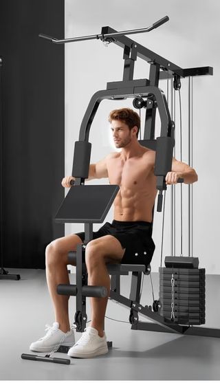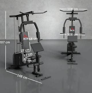 Máquina de ejercicio para entrenamiento muscular en casa. - Estructura metálica resistente. - Incluye banco y pesas. - Diseño compacto.