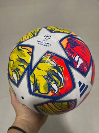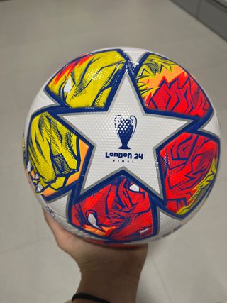 Balón de fútbol Adidas con diseño inspirado en la final de la Champions League de Londres 2024. - Diseño con estrellas y gráficos llamativos. - Logotipo de la Champions League. - Colores vibrantes: amarillo, rojo y azul. -Talla 5