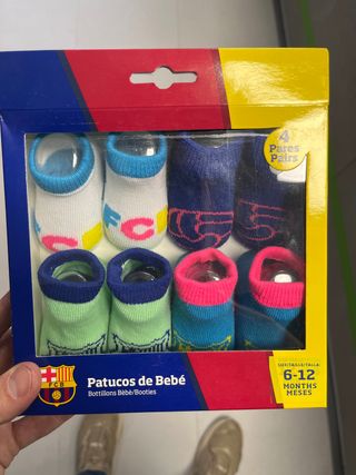 Pack de 4 pares de patucos o botitas para bebé del FC Barcelona. Talla 6-12 meses. - Diseño con los colores y escudo del club. - Incluye 4 pares de calcetines. - Talla: 6-12 meses.