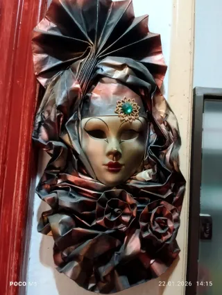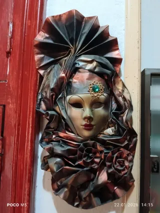 Máscara decorativa de estilo veneciano, ideal para colgar. Medidas de 38cm alto y 20cm ancho. NO HAGO ENVÍOS. - Elaborada con materiales de papel y yeso. - Diseño detallado con adornos. - Tonos metálicos y texturas. - Adorno central tipo joya.