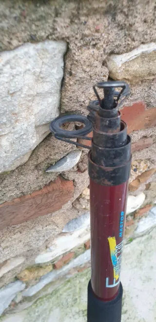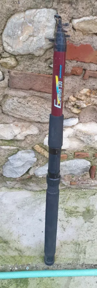 Caña de pescar telescópica de color granate y negro. Es un artículo de pesca. - Mango de goma negra. - Parte superior de color granate con detalles en amarillo y azul. Desconozco si esta completa