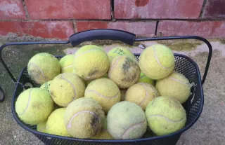 Lote de pelotas de tenis Wilson, algunas con marcas de uso. - Pelotas de tenis de la marca Wilson. - Varias marcas visibles como US Open y Roland Garros. - Color amarillo característico Hay 61