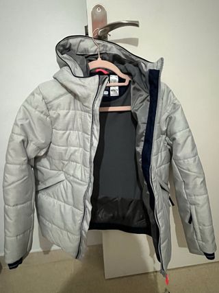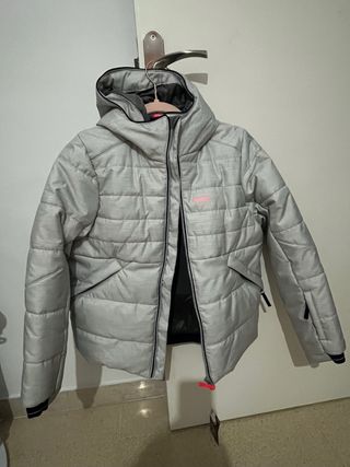 Chaqueta de esquí para niña, ideal para mantenerse abrigada en la montaña. Diseño acolchado y moderno. - Color gris jaspeado. - Capucha integrada. - Cierre de cremallera frontal. - Bolsillos laterales con cremallera. - Nueva a estrenar