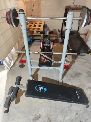 Conjunto de banco de gimnasio con barra y pesas. - Banco con soporte para barra. - Barra con discos de pesas. - Mancuernas incluidas.