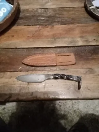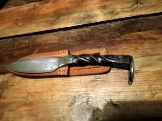 Cuchillo artesanal hecho a mano a partir de un clavo de ferrocarril. El mango presenta un diseño retorcido y está acompañado de una funda de cuero. - Hoja de acero. - Mango forjado con diseño espiral. - Incluye funda de cuero.