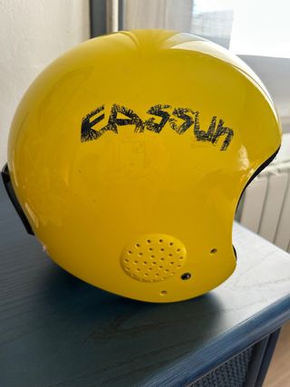 Casco de esquí de color amarillo brillante, diseñado para niños. Presenta un acabado liso y brillante. - Diseño con ventilación. - Inscripción EASSUN en la parte superior.