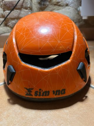 Casco de escalada y alpinismo Simond Calcit Light en color naranja. Es ligero y ventilado. Tiene un pequeño golpe en un lateral Talla L 58-61cm 280g