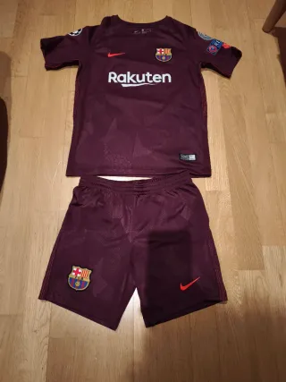 Equipación oficial del FC Barcelona para niño. Talla S 8-10 años. - Camiseta de color granate con detalles en naranja. - Escudo del FC Barcelona bordado en la camiseta y pantalón. - Logo de Nike en ambas prendas. - Inscripción 'Rakuten' en la camiseta.