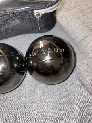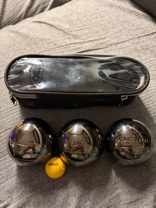 Conjunto de bolas de petanca Obut, edición limitada RICARD. - Bolas de metal pulido. - Incluye una pequeña bola amarilla. - Viene con una funda de transporte.