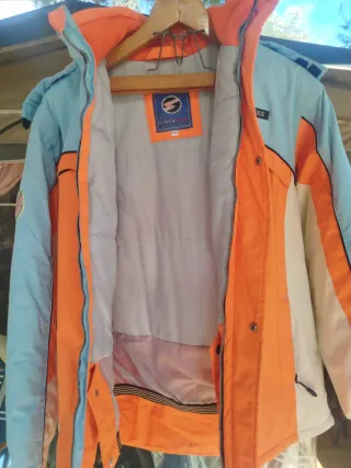 Chaqueta de esquí o nieve con un diseño llamativo en tonos azul claro, naranja y blanco. - Marca: Schuss - Cierre frontal con cremallera y botones. - Bolsillos con cremallera en el pecho. - Cordones ajustables en la cintura. - Capucha integrada.