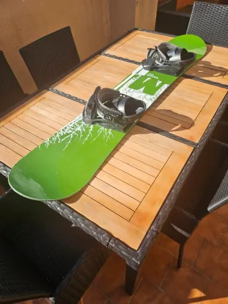 Tabla de snowboard marca Nitro con fijaciones incluidas. 158cm de largo. Usada hasta la semana pasada. La vendo barata porque tiene años y marcas de uso. Ideal como primera tabla si quieres empezar, te la vendo por lo que cuesta un día de alquiler.