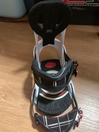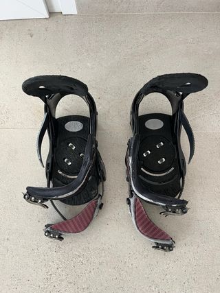 Fijaciones de snowboard Burton en talla M. Prácticamente NUEVAS!! CON CAJA y precio al que me costó - Color negro brillante. - Hebillas y correas ajustables. - Marca Burton visible.
