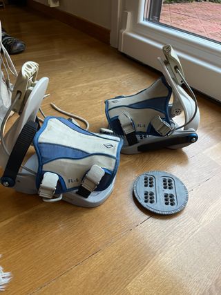 Fijaciones para snowboard en buen estado. Diseñadas para ofrecer soporte y comodidad. - Color gris y negro. - Cierres ajustables. - Marca: Flow -mod. AMP 5-FR