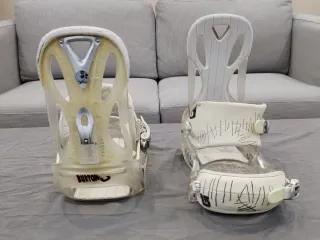 Correas de fijación para snowboard de la marca Burton. Diseñadas para un ajuste seguro y cómodo. - Material: Cuero y nylon. - Hebillas de ajuste rápido. - Logo de Burton visible.