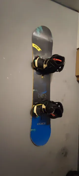 Tabla de snowboard completa con fijaciones Burton. - Fijaciones negras. - Diseño de tabla con detalles en azul y amarillo. La tabla estabussda pero bien conservada y encerada las fijaciones ya valen eso