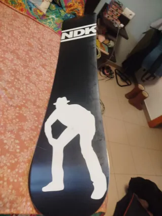 Tabla de snowboard vintage de la marca NDK, modelo RUM-DMK. Diseño en color blanco arriba y color negro debajo. - Incluye funda de transporte y fijaciones+herramientas. - Gráfico de figura con sombrero en la parte inferior símbolo hip hop RUM-DMK.