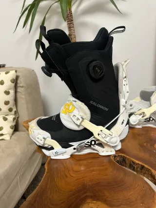 Fijaciones de snowboard de la marca Salomon en color amarillo. Talla M (40/43'5). Todo en perfecto funcionemiento, tan solo desgaste del uso. Incluye roseta central de alojamiento para tornillos. - Diseño con gráficos. - Hebillas de ajuste.