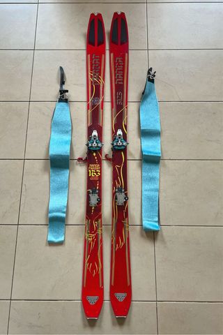 Equipo de esquí de travesia con tablas Dynafit Nanga Parbat de 163 cm, patin 79mm, fijaciones Dynafit Speed Tour con Guide Leash y pieles de focca a medida Khola (tienen dos salidas). Equipo muy polivalente y ligero (1 kg por tabla las Nanga), muy cuidado, en perfecto estado, ha tenido poco uso.