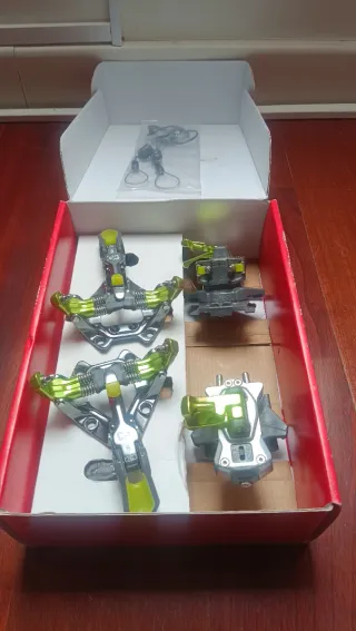 Se venden fijaciones de esquí de travesía Dynafit. El lote incluye dos punteras y una talonera. También se pueden comprar por separado, a 75 euros la pieza - Color verde y negro. - Mecanismo de muelle.