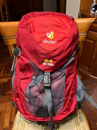 Mochila Deuter Trail 24 en color rojo. Perfecta para tus aventuras al aire libre. Nunca se ha utilizado - Capacidad 24 L+6 L - Fijación para sistema de hidratación (deuter Streamer 2.0 - ¡no incluido!) - Compartimento principal accesible por la parte superior y por delante con cremallera (permite coger objetos de la parte inferior, sin tener que sacar los de la parte superior) - Bolsillos laterales de malla. y cremallera - Bolsillo central exterior de malla - Espalda ventilada (deuter air contact) - Cubierta para lluvia (Rain cover) - Correas ajustables, la del pecho en altura NO SE ADMITEN CAMBIOS NI DEVOLUCIONES