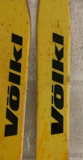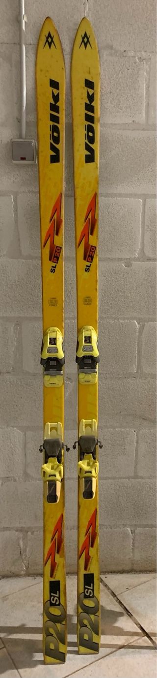 Esquís de la marca Völkl, modelo P20 SL, en llamativo color amarillo. - Diseño deportivo con detalles en rojo. - Fijaciones incluidas.