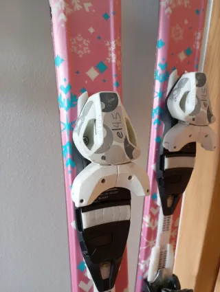 Esquís infantiles de 1.20 metros en buen estado. Listos para la nieve. - Diseño con motivos invernales en color rosa. - Fijaciones incluidas.