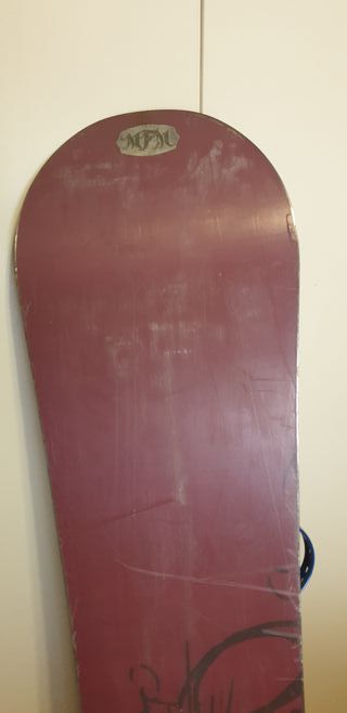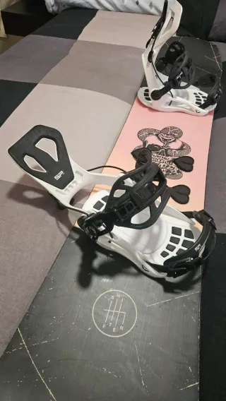 Tabla de snowboard marca GNU (150) con marcas de uso pero en perfecto funcionamiento tiene unos 20 días de uso, es una tabla perfecta para jugar super manejera y permisiva, su canto es magne tration( en forma de sierra) para más agarre en hielo, es twin directional para poder ir de switch. Las fijaciones son unas bent metal compradas a la vez que la tabla, son talla M