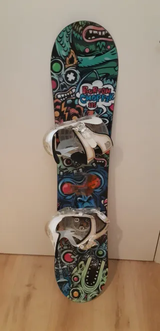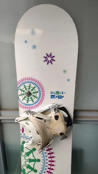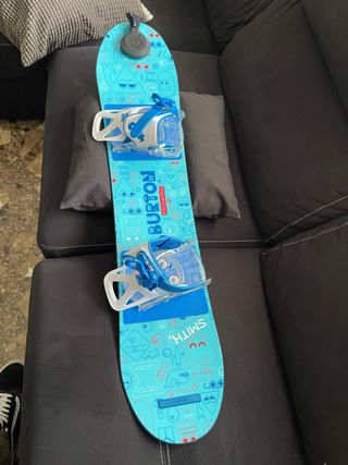 Tabla de snowboard Burton para niños de 100cm con un divertido diseño. - Diseño gráfico colorido y animado. - Fijaciones Burton incluidas. -Sistema de arrastre Burton incluido -Solo se usó una vez para probar, las manchas de la base es del encerado.