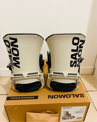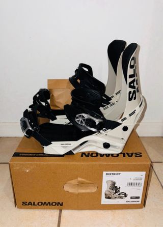 Fijaciones Salomon District para snowboard en talla L-XL. Diseñadas para ofrecer comodidad y rendimiento en la montaña. - Color blanco y negro. - Modelo District. - Talla L-XL. - Nuevas, sin ningún uso.