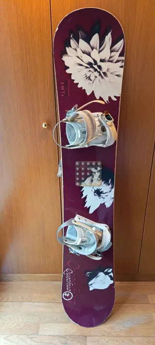 Tabla de snowboard con un diseño floral en tonos burdeos y blanco. Incluye fijaciones. - Diseño con flores grandes en la parte superior. - Fijaciones blancas y beige.