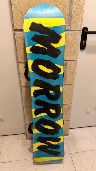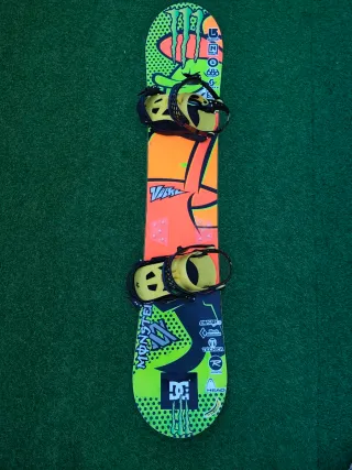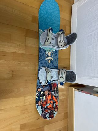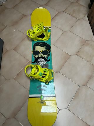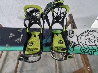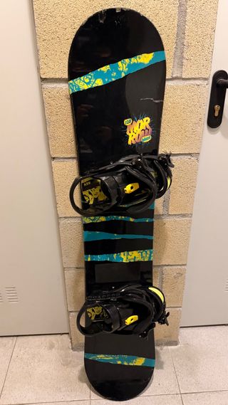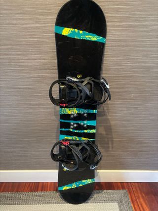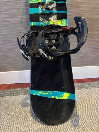 Tabla de snowboard de 128 cm con un diseño llamativo en negro, turquesa y amarillo. - Diseño con franjas horizontales. - Incluye fijaciones. - Usada pero con mucho snow por delante. -Ideal para niño o niña. Burton salomon bataleon apo union drake