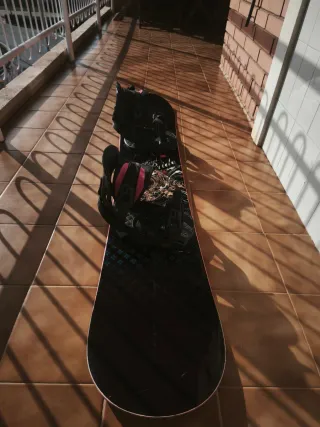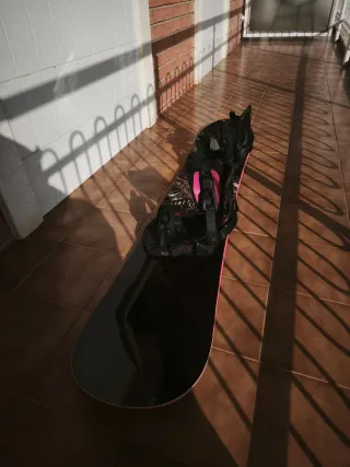 Tabla de snowboard negra con detalles en rosa y fijaciones incluidas. Lista para la nieve. - Tabla de snowboard negra. - Fijaciones negras y rosas. Utilizada solo 3 veces,está nueva