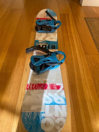 Tabla de snowboard de la marca Ride, lista para la montaña. Incluye fijaciones. una sola temporada de uso - Diseño gráfico llamativo. - Fijaciones de color azul.