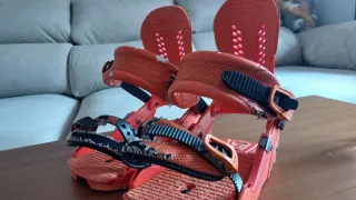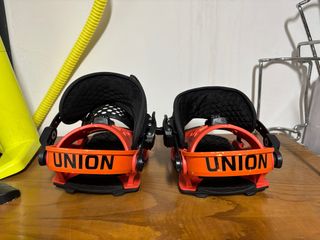Fijaciones de snowboard marca Union en color naranja. - Diseño moderno y resistente. - Hebillas y correas ajustables.