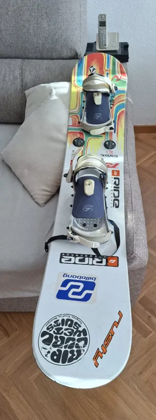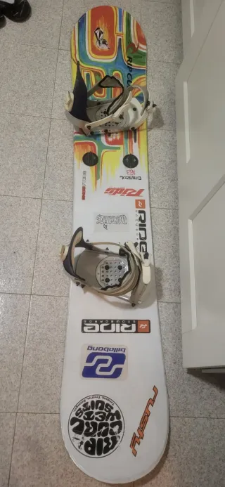 Tabla de snowboard Ride con fijaciones cierre de bridas. - Sin ningún daño en putas,muy cuidada, la vendo a este precio ya que me regalaran otra para navidades y no tengo espacio. Precio no negociable, su precio en mercado usada sería unos 120-130 - Diseño gráfico colorido en la parte superior. - Fijaciones Ride. - Pegatinas de Billabong y Rusty. - Modelo: Control 163.