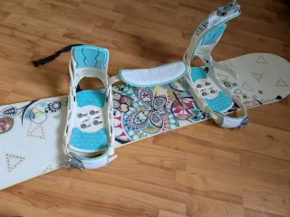 Tabla de snowboard con fijaciones. - Marca Solace - Talla 151 cm - Diseño con motivos florales y pájaro. - Fijaciones incluidas.