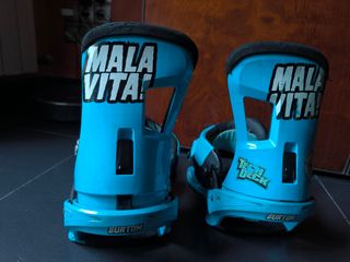 Fijaciones de snowboard Burton Malavita en color azul.Talla large. Listas para usarse, carracas y capstraps funcionan bien. Lo único en la cincha que coge el empeine, el acolchado está un poco roto, pero no afecta para naa al funcionamiento - Diseño Malavita. - Marca Burton en la base.