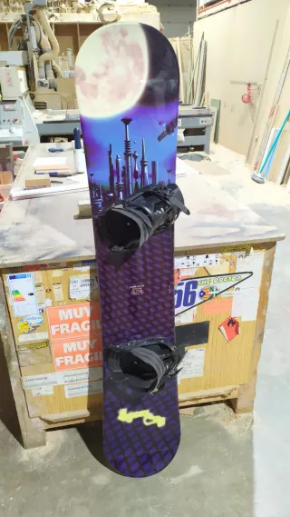 Tabla de snowboard con diseño futurista. - Gráficos de ciudad futurista y luna. - Base púrpura con patrón de rombos. - Fijaciones negras incluidas. Se vende por no usar,se compró pero nunca se usó por lesión. Tabla rígida.