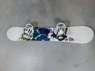 Tabla de snowboard con un diseño llamativo y moderno. Incluye fijaciones. Camber: Clásico Tamaño de la tabla: 159 cm. Tamaño de las fijaciones: L Lista para usar: reparada, afilada y encerada al finalizar la temporada 2024-2025.