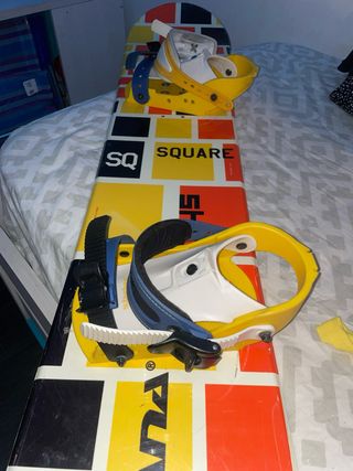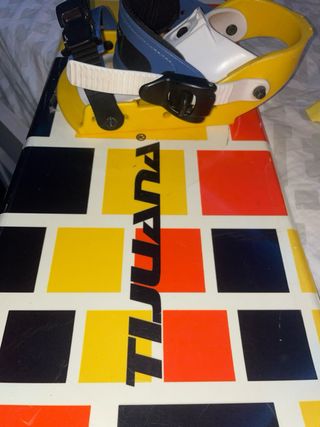 Tabla de snowboard marca Tijuana, modelo 145, ideal para principiantes. Su diseño es llamativo con bloques de colores. Esta encerada, lista para usar. Le he cambiado las correas, para que vayan genial - Fijaciones incluidas. - Diseño con cuadrados y texto SQ SQUARE. - Base con diseño de bloques de colores y texto FLUX.