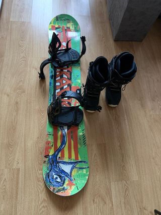 Snowboard Toxic con fijaciones. Usado pero en buen estado. Tiene algo de la pintura levantado pero no es importante. Con una pulida y encerada se queda como nueva. 157 cm. Regalo botas Salomon talla 45 y manoplas nuevas. Las botas están bastante usadas aunque para un apuro pueden servir. Tengo un casco seminuevo Neak peak por 15€ mas.