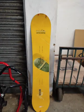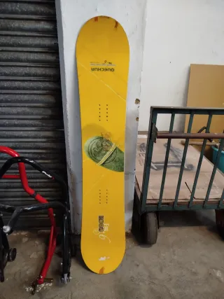 Tabla de snowboard Quechua en color amarillo, con un diseño llamativo. - Marca: Quechua - Color: Amarillo - Diseño gráfico central - Fijaciones para botas de snowboard