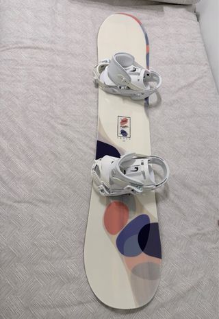 Tabla de snowboard Salomon para mujer, incluye botas y fijaciones todo de la misma marca. Lista para la nieve. - Diseño moderno con detalles gráficos. - Fijaciones blancas ajustables. - Botas cómodas y resistentes. Pie 36. Usada 10 veces máximo. Lo compré hace 2 años nuevo. Solo tiene picadas en algún lateral. También doy las fundas protectoras de las botas y de la tabla (del decathlon).