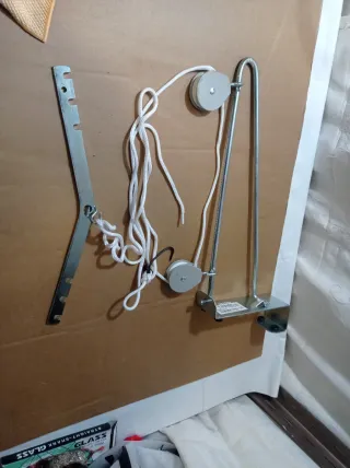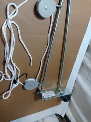 Sistema de polea con cuerda para ejercicios. - Incluye dos poleas y una cuerda blanca. - Pieza metálica para fijación.