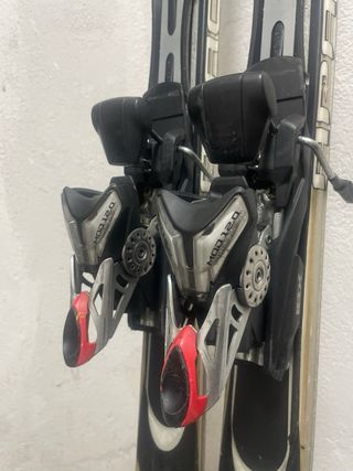 Esquís de la marca Salomon con fijaciones. - Diseño blanco con detalles en rojo y azul. - Logo de Salomon visible en la parte superior. Están muy desgastados. Dos juegos de esquís.