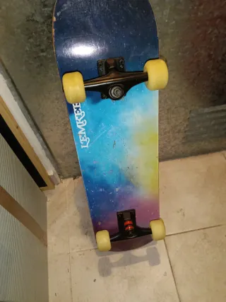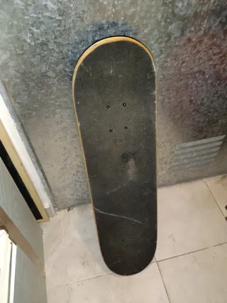 Monopatín con lija negra. Tiene ligeros roces en la lija y bordes, pero de muy poco uso. Ruedas como nuevas y las fijaciones y tornillos perfectos. - Superficie de madera. - Diseño clásico. 20 cms de ancho y 80 cms de largo