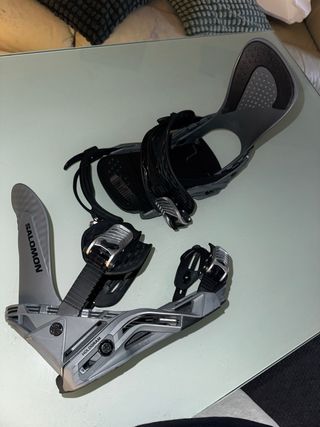 Fijaciones de snowboard Salomon Hologram, modelo 2025. Diseñadas para ofrecer un buen rendimiento en la montaña. - Color gris y negro. - Correa de tobillo y puntera ajustables. - Base y highback de material resistente y muy flexible! Solo tienen un uso, compradas en diciembre de 2025, las vendo porque me han regalado unas nuevas!!! TALLA -M ( 255-285mm) Longitud pie