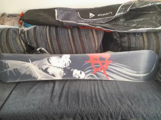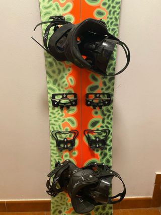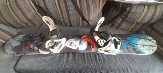 Con uso pero en buenas condiciones, excelente para empezar en el mundo del snowboard. (Medidas última foto) Fijaciones en muy buen estado incluidas. Bolsa se transporte como nueva. Quien quiera ver especificaciones técnicas de la tabla que ponga en google Volkl dash snowboard.