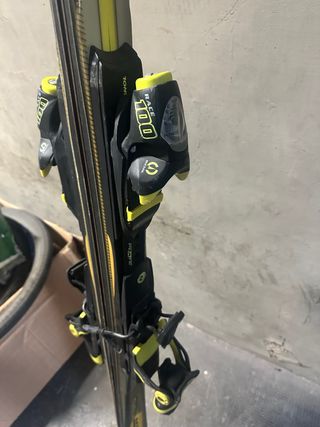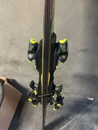 Esquís de competición Race 100 con fijaciones. - Fijaciones de alta gama. - Diseño deportivo en negro y amarillo.