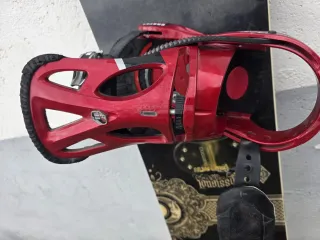 Tabla de snowboard de 155cm de largo, lista para la montaña. Incluye fijaciones. - Diseño con detalles en rojo y negro. - Fijaciones negras ajustables.
